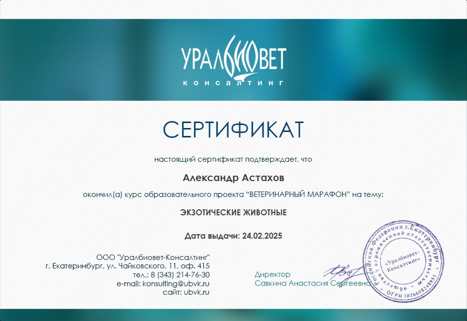 Специальность: ветеринарный врач общей практики, терапевт, хирург, ратолог (хомяки, крысы, шиншиллы, кролики) Ведёт отдельные травматологические приемы.